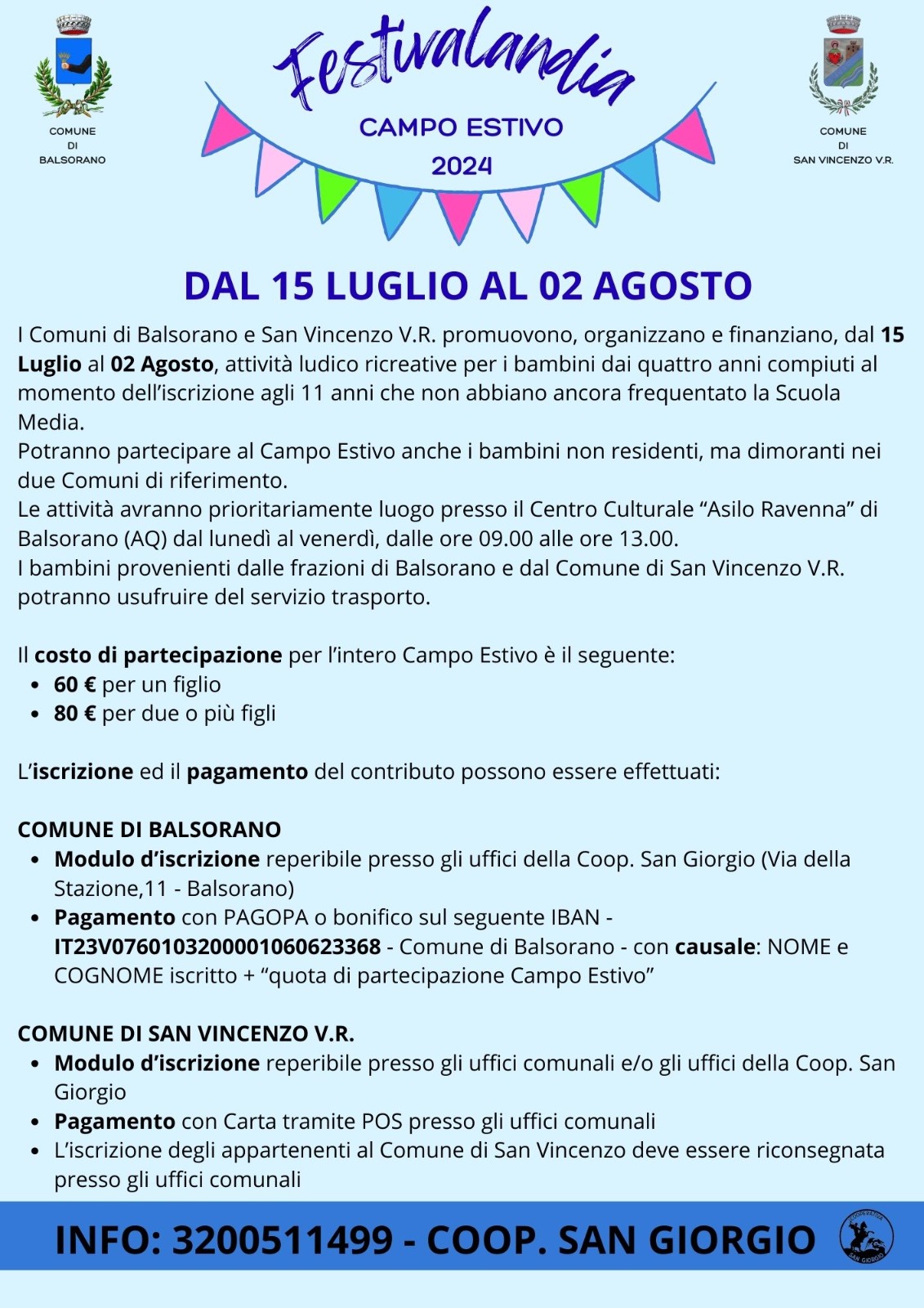 I Comuni di Balsorano e San Vincenzo V. R. organizzano e finanziano il Centro Estivo 2024, che si terrà dal 15 luglio al 2 agosto 2024 dalle ore 9 alle ore 13:00.