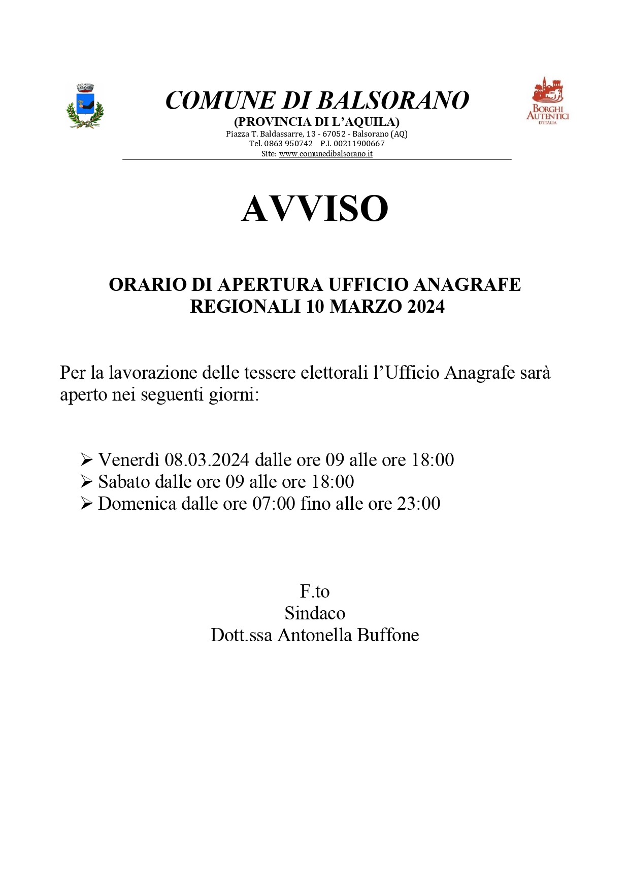 Apertura Ufficio Anagrafe per le Regionali del 10 marzo 2024